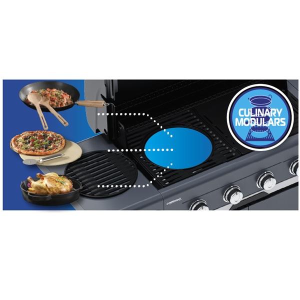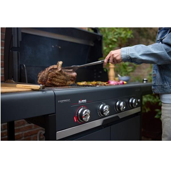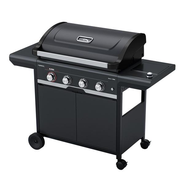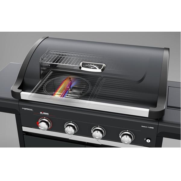Plynový gril Campingaz Select 4 EXS SBS se čtyřmi nerezovými hořáky, kdy jeden hořák je vybaven technologií Searing boost system (SBS) pro zvýšení výkonu o 23 %. Bočním vařič je ideální pro přípravu omáček, polévek a příloh. Součástí grilu je rošt Culinary modular Cast-iron grid a oboustranný tál.