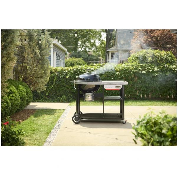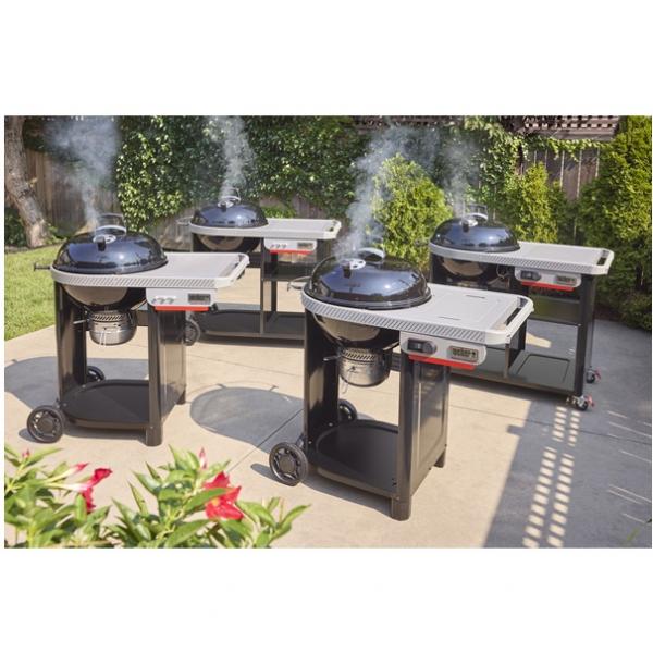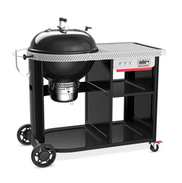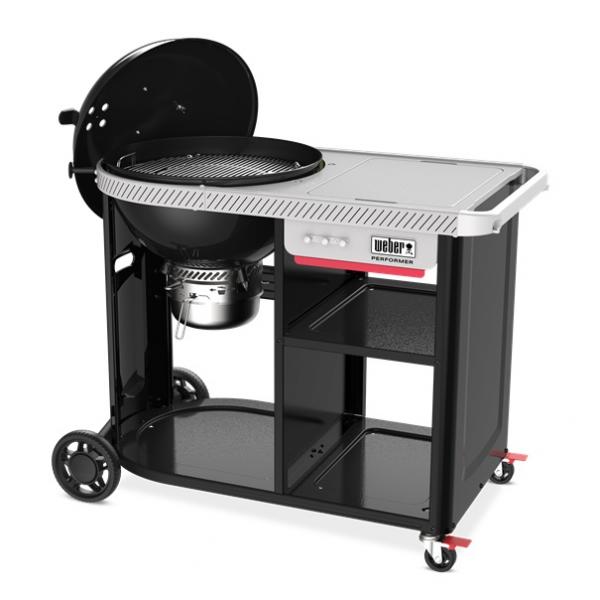 Kotlový gril Weber® obohacený o chytré úložné a pracovní prostory. Vylepšený gril Performer Premium s průměrem 57 cm je zabudován do prémiového vozíku, který nabízí dvě úložné police, boční stolek Weber Works kompatibilní s XL vkládacími doplňky a boční lištu Weber Works pro nacvakávací příslušenství.