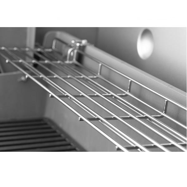 - Grease management systém pomáhá předcházet samovolnému vznícení tuku a usnadňuje čištění - odkapávající šťáva, která se nevypaří na aroma kolejnicích je odvedena pryč od hořáků do snadno přístupné nádoby pod grilovací vanou